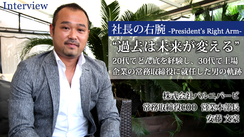 飲食店には不向きな立地に積極的に出店し、人気店を作り出す株式会社バルニバービ。年商100億円 に迫る勢いで成長を続ける同社代表取締役社長の佐藤裕久氏は、数々のメディアでも特集されている。その佐藤氏の右腕とも言える存在で、ともにバルニバービを支える人物が、常務取締役COO営業本部長の安藤文豪氏だ。25歳で起業した会社の成功と挫折、そして佐藤社長との出会いを経て、現在の地位に上り詰めた軌跡を辿る。