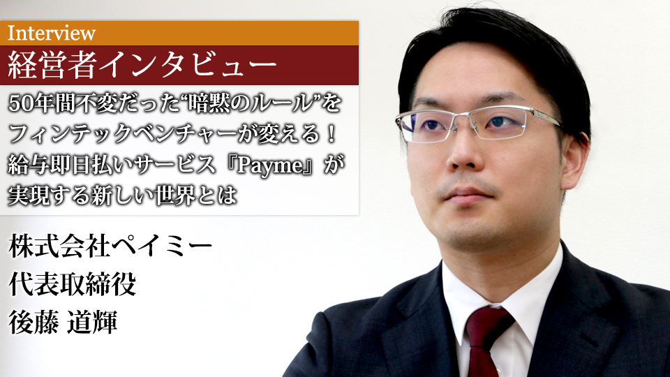 約50年間、多くの企業が採用していた“末締め翌月末払い”という給与の支払い方。そこにメスを入れたのが、株式会社ペイミーだ。実際の労働時間に合わせ、給与を即日受け取れるサービス『Payme』を2017年11月にリリース。フィンテックの新たなサービスとして、今注目を集めている。同社代表取締役の後藤道輝氏のインタビューから、『Payme』を通じて築かれる新たな日本の姿に迫る。