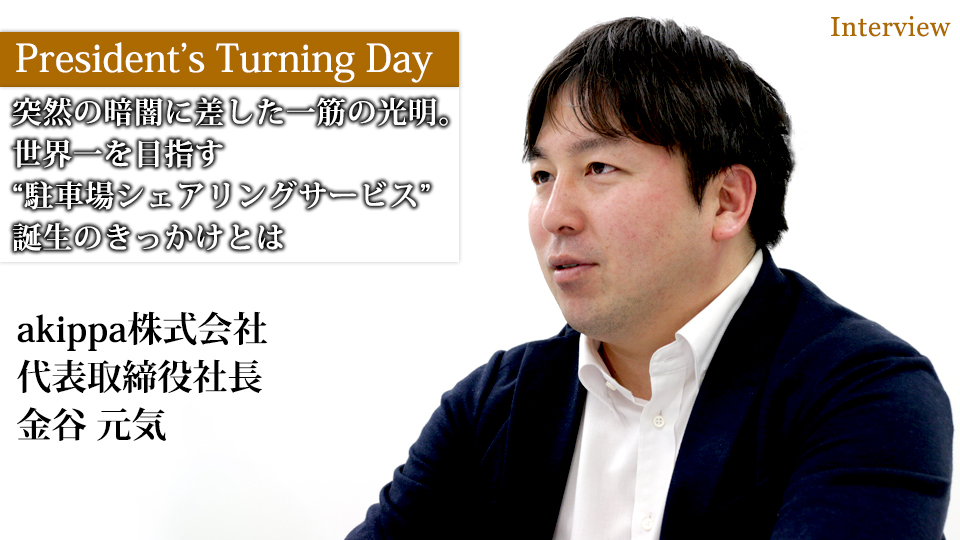 全国の未契約の月極や個人所有の駐車場をオンライン予約し利用できる駐車場シェアリングサービスアプリ『akippa』。2014年にリリースされて以来、IVS 2014 Fall Launch Padで優勝を勝ち取るなど、『akippa』を開発したakippa株式会社(2015年2月より「株式会社ギャラクシーエージェンシー」から社名変更)は瞬く間に注目を集めた。代表取締役社長である金谷元気氏は、かつてサッカーの地域リーグでプレーしていた経験を持つ。意を決し、サッカーを引退して起業した後に陥った厳しい現実。そんな中、偶然起こったある出来事がきっかけとなり、自身の意識に大きな変化が起こった。その瞬間、『akippa』へと繋がる道が拓かれることとなる。金谷社長の仕事観が変わった“Turning Day”に起こったこととは―。