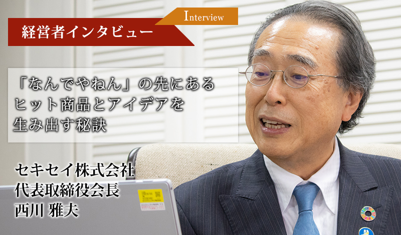 西川 雅夫(にしかわ まさお)/1948年大阪生まれ。甲南大学経営学部卒業後、大阪リコーを経て、1972年セキセイ株式会社に入社、1985年に社長就任。2013年から代表取締役会長を務める。全日本文具協会理事、大阪紙製品工業会副会長、大阪ファイル・バインダー協会会長、関西・日本フィンランド協会理事、大阪デザインセンター理事、DAS総合デザイナー協会会員、日本の伝統を守る会会員、芦屋大学客員教授などを歴任。2009年春には黄綬褒章受章。2007年著書『なんでやねん』、2011年『新なんでやねん』、2017年『超なんでやねん』も出版。趣味はヨット、絵画など。