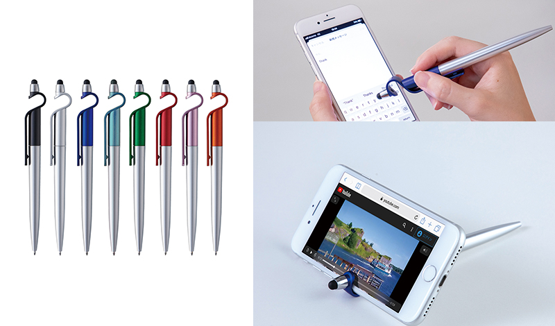 ボールペンとしての役割以外に、スマートフォンやタブレットのタッチペンとしても使え、さらにスマートフォンを立てるスタンドにもなるのが特徴です。