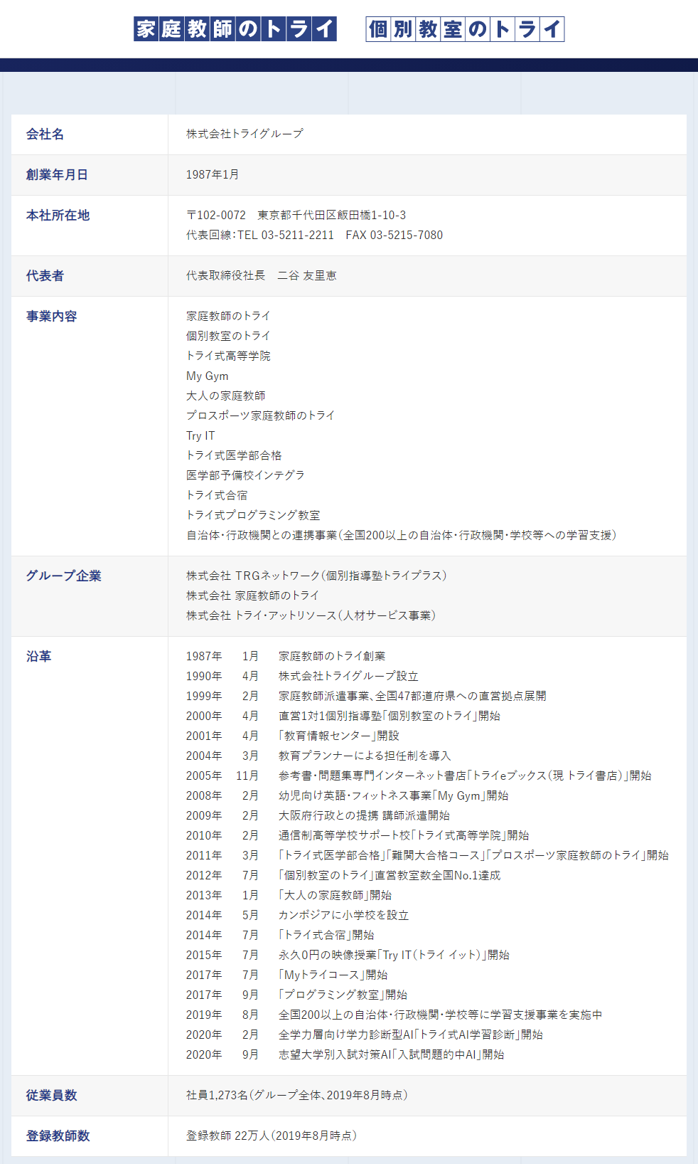 株式会社トライグループは、家庭教師のトライを軸に、個別教室のトライ、トライ式医学部合格、プロスポーツ家庭教師、大人の家庭教師など様々な事業を展開してきた。