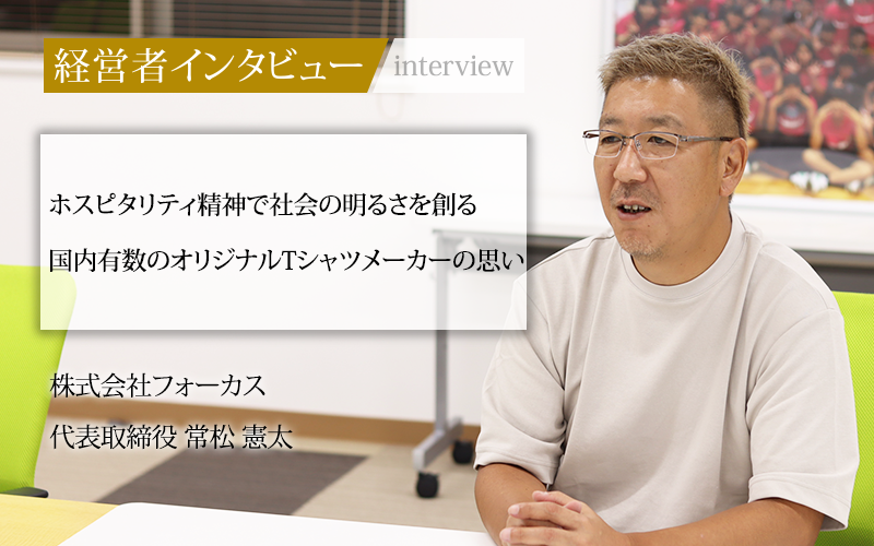 常松 憲太(つねまつ・けんた)/高校卒業後はさまざまな仕事を経験し、1998年にアスフィール株式会社に入社。2009年にグッズ販売を行う株式会社フォーカスを設立。その後オリジナルTシャツの製造販売に特化し、2015年には売上10億円を突破。新型コロナウイルスの蔓延により売上が大きく落ち込んだものの、設備投資を始めとした経営改革を行い、2022年12月時点で売上20億円を達成している。