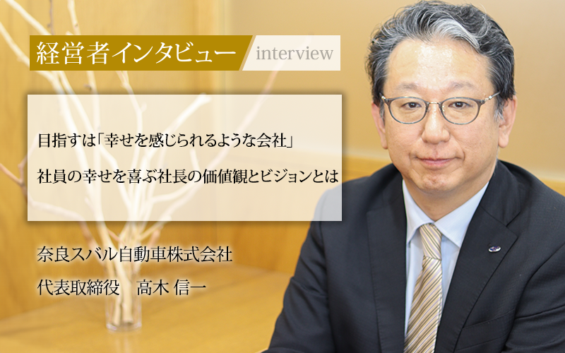 社員思いの社長に率いられる奈良スバル自動車の経営理念は、「企業活動を通じての幸福の実現」。会社をどう成長させ、社員にどうあってほしいのか、会社の価値観やビジョンを高木社長にうかがった。