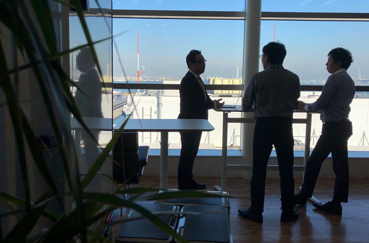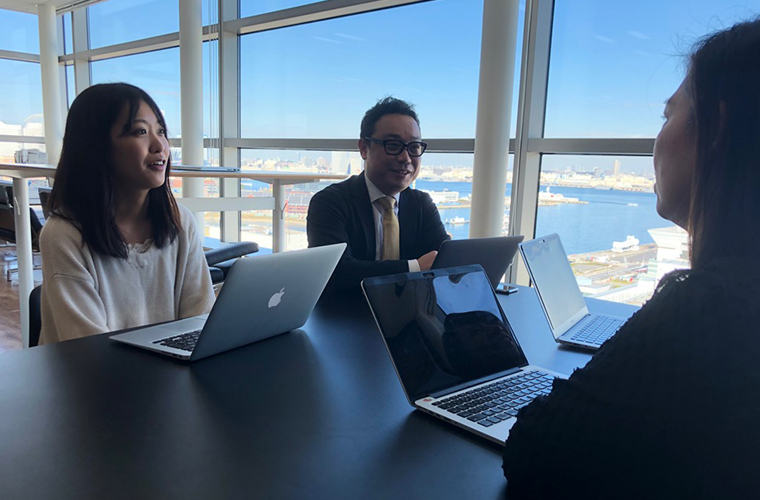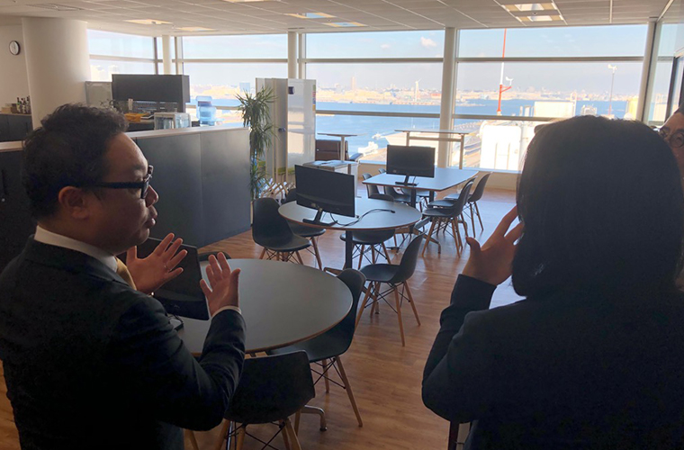 ITベンチャーとしては珍しく、横浜に本社を置くアペルザ社。オフィスに入ると、赤レンガ倉庫や大さん橋といった素敵な景色が一望できるつくりになっていました!