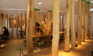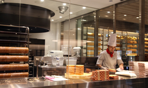 -バームクーヘンのクラブハリエのショップでは、製造工程をそのままに見せるという斬新なスタイルが話題となりました。