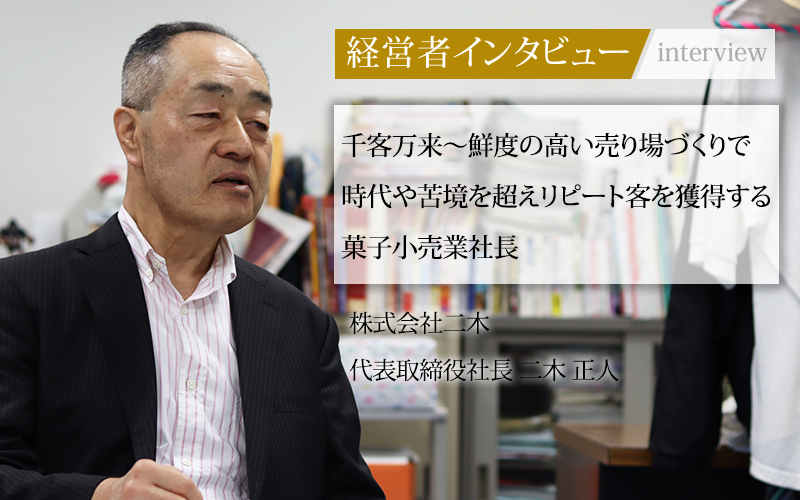 月に300種類もの菓子を試食してきたという二木社長。研究熱心であり、根っからの商売好きな気質が談話のあらゆる箇所で感じられた。