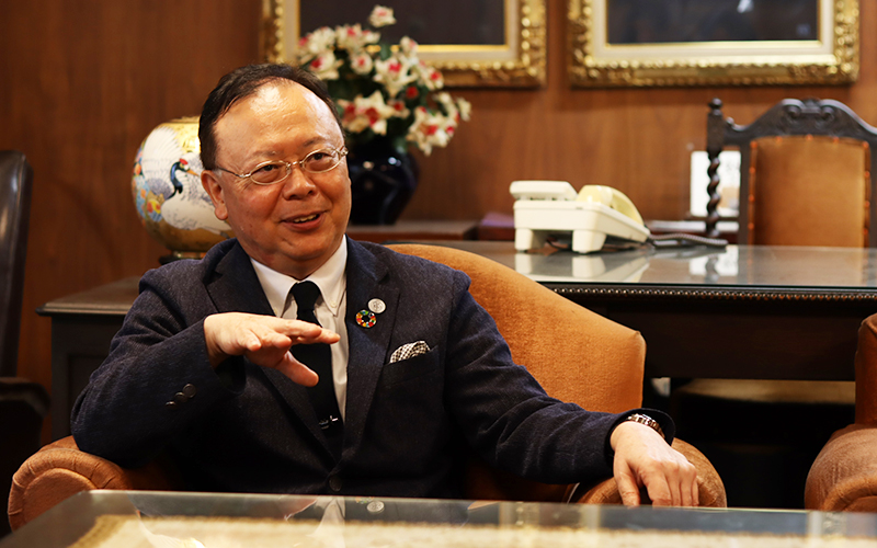 120年以上もの歴史を持つ企業で、台湾におけるプリント基板の成功に始まり、微細加工機の開発に携わり、その事業を成長させた海藤会長。
