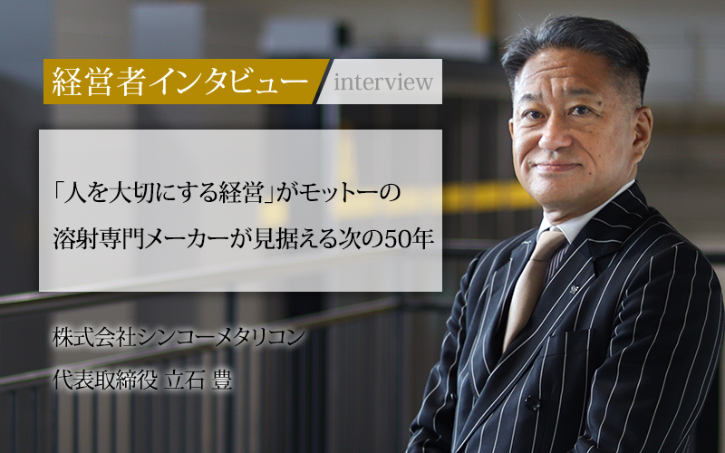 立石豊(たていし・ゆたか)/1961年生まれ京都出身。1983年大阪芸術大学 映像計画学科卒業後、1985年に祖父が創業した溶射のパイオニア的存在であるシンコーメタリコンに入社。1994年に代表取締役に就任。「人を大切にする経営」をモットーに社員の女性活躍と男性の育児休暇取得など、働きやすい環境作りの取り組みが評価され「ホワイト企業大賞」を受賞。新プロジェクト「未来にツナグNEXT50」のファーストステップとして、2023年5月に新工場を設立。