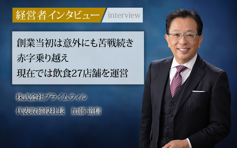 同社をけん引する加藤道信氏は、株式会社ダスキン在籍中に企業オーナーとしてプライムウィルを起業し、ダスキン退社後に代表取締役に専従した異色の経歴の持ち主。