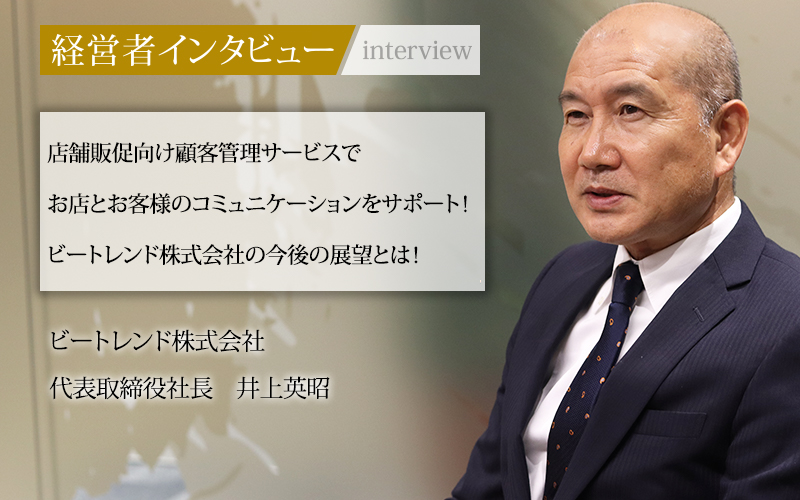 スマートフォンアプリ・会員証、ポイント、マイレージ、電子スタンプ、メールやLINE、SMSなどの情報配信といった店舗販促に必要な機能を、1つのサービスとして提供しているのはビートレンド株式会社のみ。「お客様に誠実に向き合い、常にその時代のトレンドとなる会社でいたい」という思いを持ち、約15年黒字経営を続ける井上英昭社長。拠点拡大や事業発展など、さらなる成長を続けるビートレンド株式会社から、今後も目が離せない。