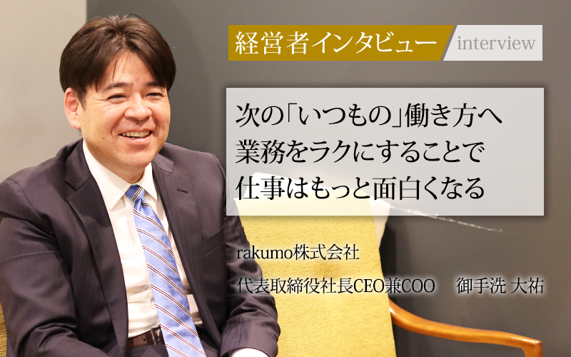 若手時代からチャレンジを続け、数々の事業を手掛けてきた御手洗社長。「仕事をラクに。オモシロく。」の企業ビジョンを実現するため、今後さらなるサービスを構想中だと言う。rakumoの新事業が私たちの働き方をよりラクに、楽しくしてくれることに期待したい。