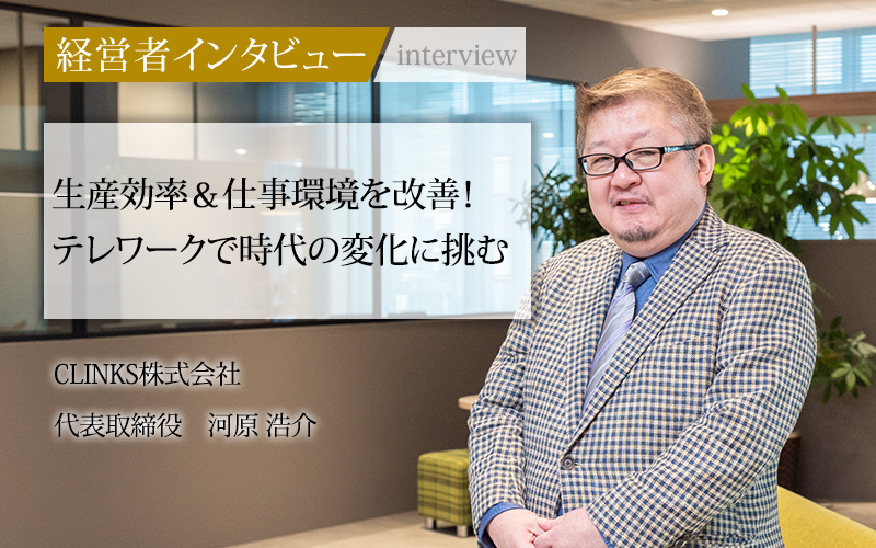 河原浩介(かわはら・こうすけ)/1963年福岡県出身。早稲田大学商学部卒業後、マツダ株式会社に入社。1995年32歳でIT業界に転進し、2002年12月1人でCLINKS株式会社を設立。業界未経験から従業員数1000人規模にまでCLINKSを成長させた。現在、同社代表取締役として、テレワークを日本の働き方のスタンダードとするべく推進中。