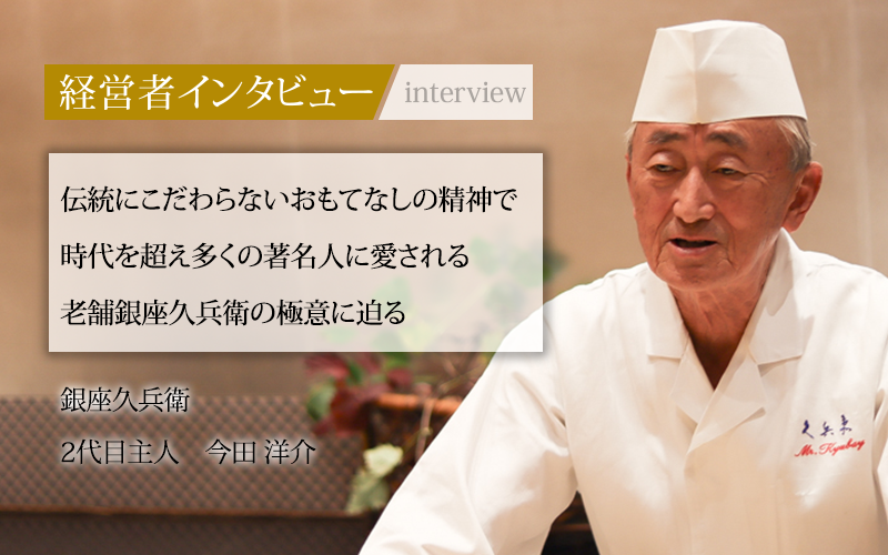 先代の時代から多くの著名人が通った名店久兵衛。老舗寿司店と聞くと気軽には行きづらいようにも感じるが、久兵衛では「明朗会計」や「顧客平等」の推進など、昔からある業界に新しい風を吹かせている。2代目主人の今田洋介に寿司職人を志したきっかけや店舗運営で大切にしていること、今後の店舗戦略などをうかがった。