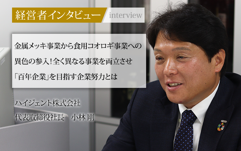 小林剛(こばやし・つよし)/1971年東京都生まれ。大学卒業後、1995年大成建設株式会社に入社。都市開発・作業所事務・営業部などを渡り歩き、2010年ハイジェント株式会社に入社。2018年に代表取締役社長に就任。専業である表面処理事業、ハーメチックシール事業の他、2021年から食用コオロギ事業を展開している。