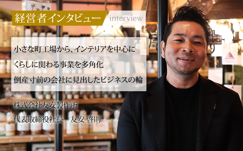 友安啓則(ともやす・ひろのり)/高校からアメリカ留学、City University of Seattleにて経営学修士 MBAを取得。大学在学中から商社で働き、友人と起業。2004年に帰国、父親が営む線材加工製造業の株式会社友安製作所へ入社し、インテリアの輸入販売をする新事業を立ち上げ、オンラインでの商品販売を開始。2016年代表取締役社長に就任。東京、大阪、博多にて、インテリアとDIYとカフェの融合をコンセプトにした店舗を運営。
