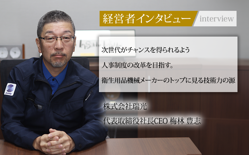 梅林豊志(うめばやし・とよし)/1963年大阪府生まれ。1990年、株式会社瑞光に入社。取締役設計部長を経て2011年に取締役就任。2018年5月代表取締役副社長COO、2020年5月代表取締役社長CEOに就任。2021年に企業理念を一新してコーポレートメッセージ「Make the Impossible Possible」を掲げ、新たな行動指針「THE ZUIKO WAY」(独創する、技術を深める、開拓する、共生する)を制定。「お客様の期待を超える技術力・開発力」でものづくりのグローバルメーカーを目指す。2023年、東証スタンダードから東証プライムへの市場区分変更を実現。