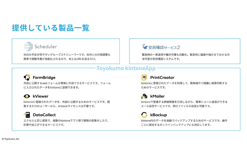 同社は中小企業のIT化に向けて、緊急時の議論や指示を可能にする『安否確認サービス2』や、サイボウズkintoneに連携する『FormBridge』などを提供している。