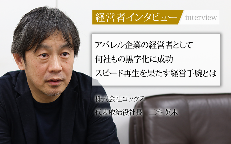 株式会社コックスのV字回復をけん引する代表取締役社長の三宅英木氏は、アパレルメーカー大手のサンエー・インターナショナルを皮切りに、オンワード樫山、イトキンなど名だたる大手企業の担当事業を黒字化させてきた。