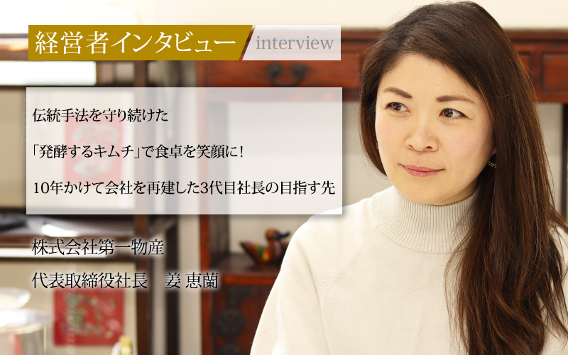 上野で創業したキムチのメーカー兼商社である第一物産は、伝統の手法を守り60年以上キムチをつくり続けている。母である先代から会社を継いだ姜社長に、社長就任時のいきさつやキムチへのこだわり、今後の展望について話をうかがった。