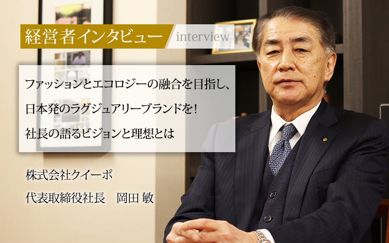 岡田敏/1960年富山県生まれ。1982年に専修大学卒業後、小杉産業株式会社(現株式会社コスギ)入社。1990年株式会社クイーポに入社。経理部・総務部配属後、営業本部長を経て、2009年代表取締役社長に就任。創業者の意志を受け継ぎ、ファッションとエコロジーの融合を軸とした経営を行っている。