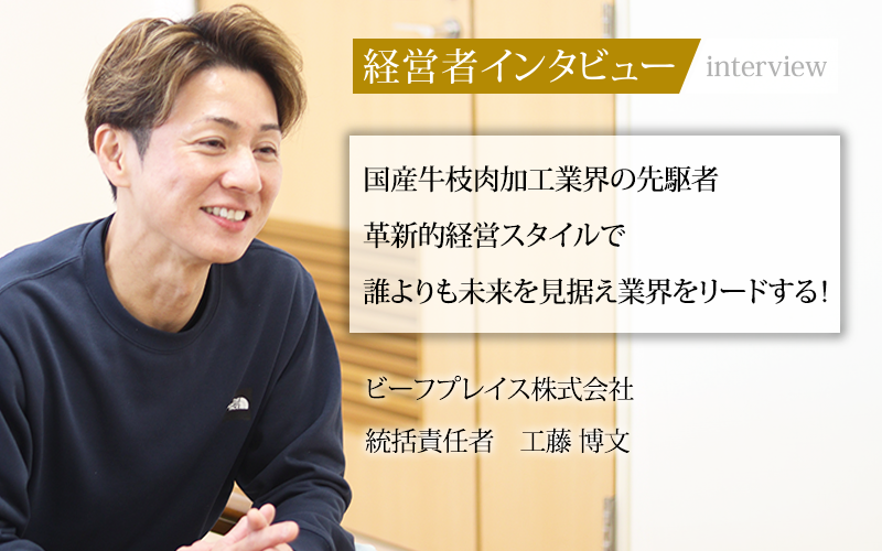 工藤博文/1977年、岡山県生まれ。大阪府の専門学校を卒業後、株式会社東急ホテルチェーンに入社し、その後、兵庫県の国産牛肉卸売会社からヘッドハンティングされる。2002年に株式会社一冨士本店へ入社し、牛枝肉加工業務に特化した「第二事業部」を立ち上げる。2012年に「第二事業部」を独立分社化し、一冨士ビーフプレイス株式会社を設立する。同年、取締役に就任。2023年、ビーフプレイス株式会社に社名変更。