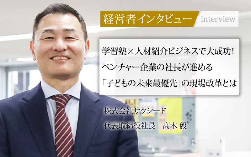 2004年4月に設立され、個別指導教室の運営からスタートした「株式会社サクシード」。今や家庭教師の紹介に加えて、教育・福祉現場への人材支援サービスまで展開するベンチャー企業である。代表取締役社長の高木毅氏に、設立の経緯や今後のビジョンをうかがった。
