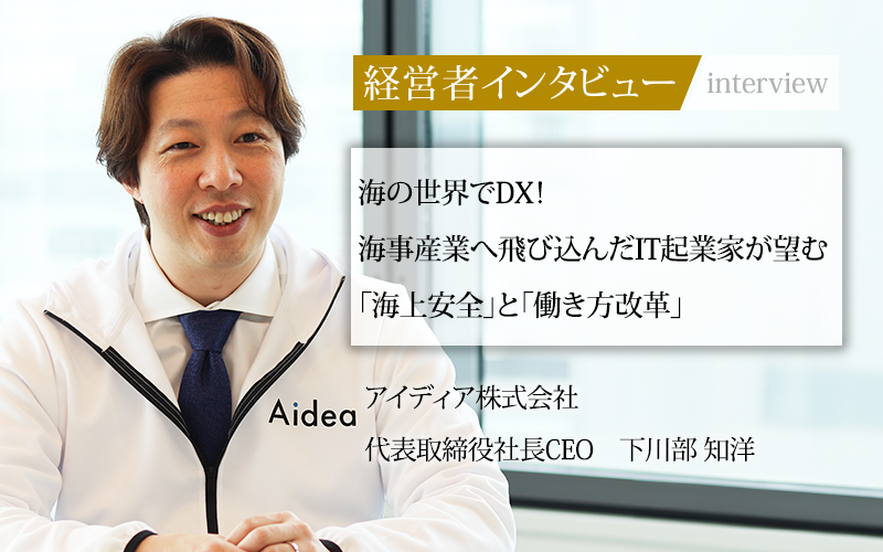 下川部知洋(しもかわべ・ともひろ)/2018年にアイディア株式会社を創業。ITエンジニアとしての専門性と港湾事業の経営者としての知見を活かし、DXで海事産業の発展に貢献する。高い技術力を背景に、海事産業向けプラットフォーム「Aisea」(アイシア)の開発・サービス化に成功。官庁や大手企業とのプロジェクトを数多くプロデュースし、プロダクト開発から調査研究・コンサルティングまでを一貫して提供するアイディア社の舵取りを担当する。