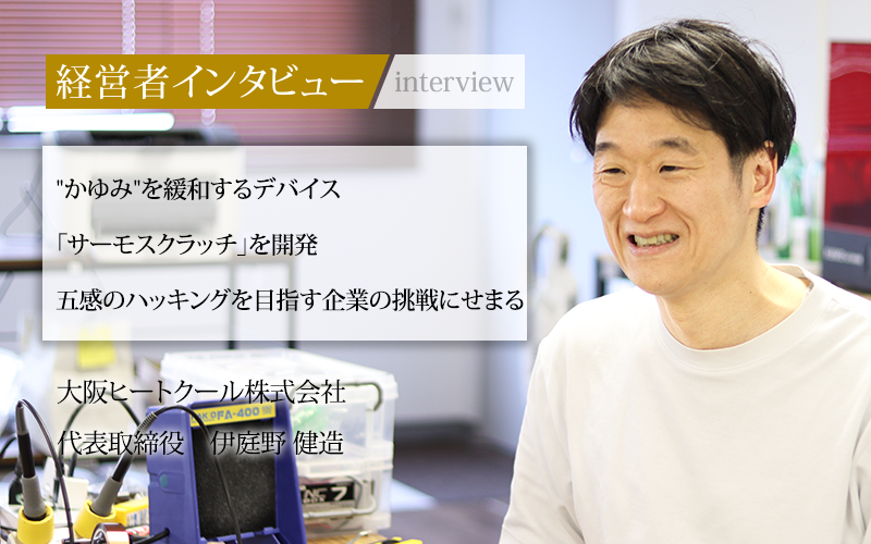大阪ヒートクール株式会社は、温度による五感のハッキングを目指し、阪大助教である伊庭野氏を中心に大学教員5人でつくられた会社だ。かゆみを緩和するデバイス「ThermoScratch(サーモスクラッチ)」と生理痛VR体験デバイス「Perionoid(ピリオノイド)」を製品に持つ。
