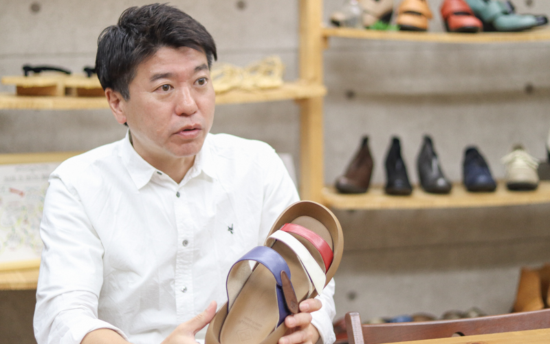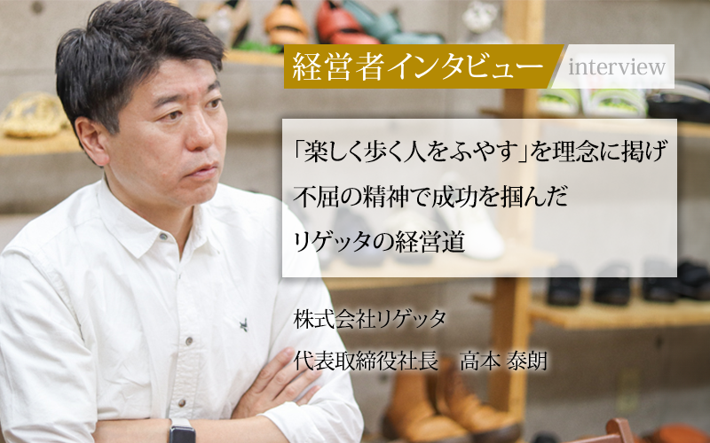 高本泰朗(たかもと・やすお)/1975年生。大阪市生野区出身。高校卒業後、4年間の靴修業を経て家業に就く。下請け業からメーカーに転身し2005年にリゲッタブランドを立ち上げ世界10か国でブランド展開。生まれ育った生野区の地域活性化にも尽力しており、地域と包括連携協定を結んでいる。2011年に事業承継し代表取締役に。社員全員で作成した経営理念「楽しく歩く人をふやす」を共有している。
