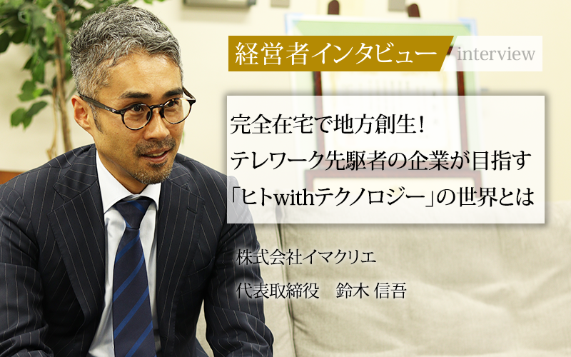 鈴木信吾(すずき・しんご)/大手メーカー、コンサルティング会社での勤務を経て、2007年に株式会社イマクリエを創業。東日本大震災を機にテレワークを導入し、社員全員がフルリモートで働く完全テレワーク型の事業モデルを確立した。企業向けにテレワークを活用したアウトソーシング事業、テレワーク導入のコンサルティング事業を展開する他、2020年よりテレワークを活用した雇用創出・企業誘致などの地方創生支援事業を開始。