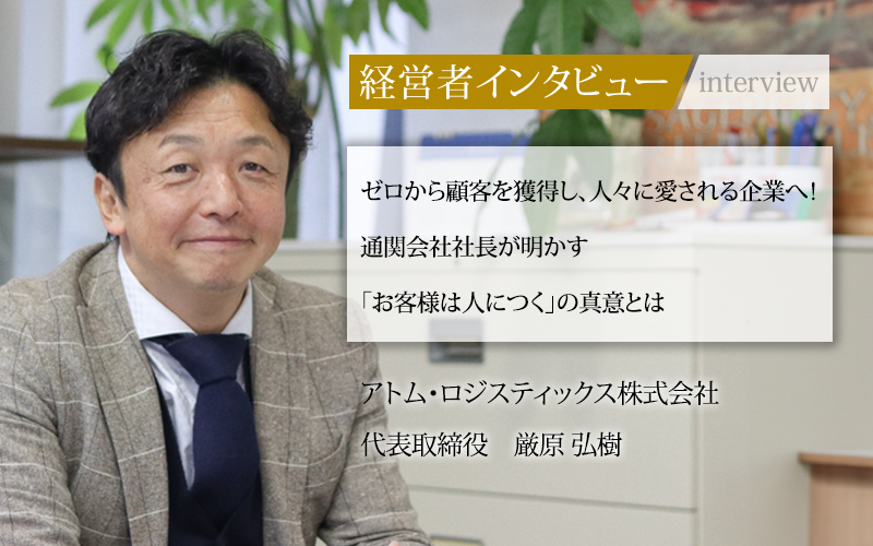 13年前、彼がたった一人で始めたアトム・ロジスティックス株式会社は「窓口はひとつ 梱包から通関、輸送、現地配送まで一貫物流サービスもできる通関会社(乙仲)」として、現在、40名弱の社員が集まるまでに成長している。今回は同社代表取締役の厳原弘樹氏に、起業から今に至るまでの取り組みや顧客や、社員との向き合い方についてうかがった。