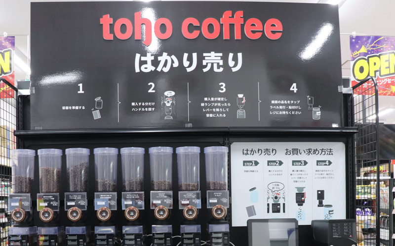 通常のA-プライスより売り場面積は約4割と小さいものの、自社焙煎のコーヒー量り売りをはじめ、地域のニーズにあった品揃えとしました。繁華街の飲食店様は店舗の構造上、食材の保管スペースが狭くなる傾向があり、在庫のストックが難しく、是非パントリー代わりにご利用いただきたいと思っています。