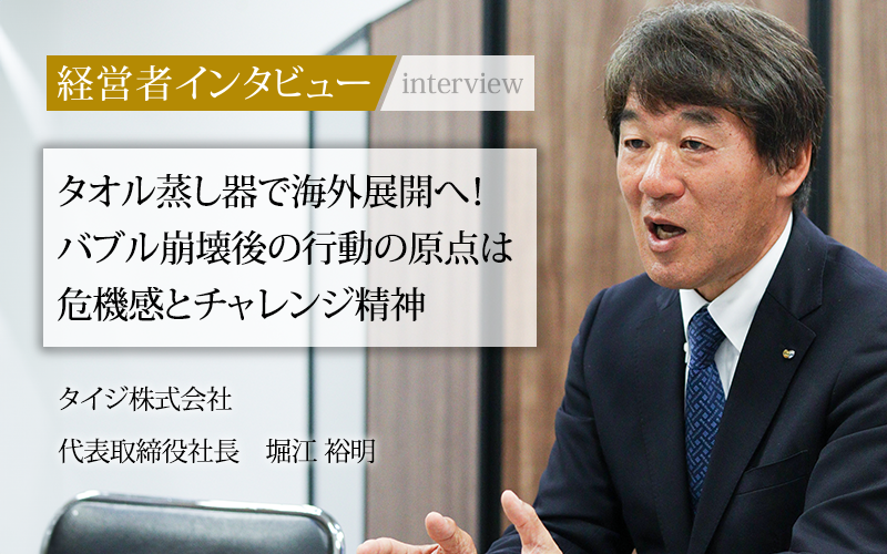 1964年に「電気式タオル蒸し器」のメーカーとして創業したタイジ株式会社。夏は冷たく、冬は温かいおしぼりは飲食店の定番となり、今では日本らしい文化として世界に知られている。2代目となる同社の代表取締役社長、堀江裕明氏に企業の歩みや今後の展望をうかがった。