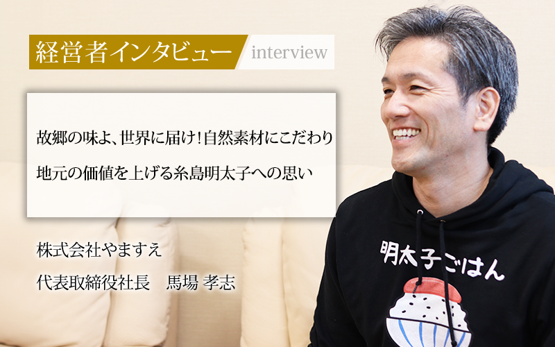 1996年に創業した株式会社やますえ。水産加工品の卸売りをスタートに、現在では福岡県糸島市発の明太子製造メーカーとしての立場を築いている。おいしいことはもちろん、安心安全な品質にもこだわった製品には定評があり、多くのユーザーから支持されている。代表取締役社長として活躍中の馬場孝志氏に、株式会社やますえの事業内容や今後の展望についてうかがった。