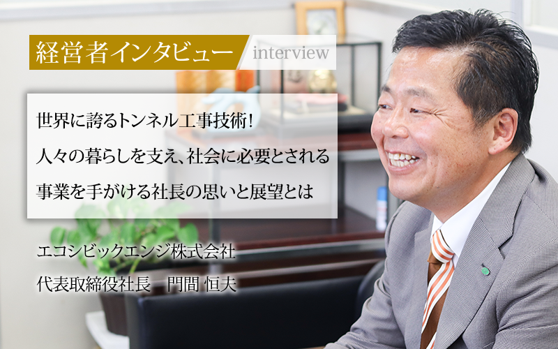1977年に創業したエコシビックエンジ株式会社は、長年築き上げた取引先との良好な信頼関係を保ちつつ、技術の向上や人材導入で新しいことを成し遂げ、国内の数多くのトンネル工事に携わってきた。同社の代表を務める門間恒夫社長に、経営理念や今後の展望、そして採用にかける思いをうかがった。