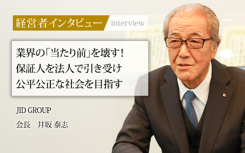 日本の不動産業界はかつて、賃貸契約の保証人を2人立てなければならず、そもそも保証人を立てなければ家を借りられない時代があった。その制度に疑問を抱き、一念発起して起業。保証人を法人として引き受け、入居者の安心をサポートするさまざまな仕組みづくりに取り組んできた。創業者でJID GROUP会長である井坂泰志氏に話をうかがった。