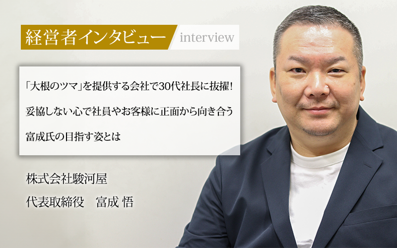 業歴50年にわたって料理に添えられる「大根のツマ」を提供している株式会社駿河屋。役職者でもない一般社員であった富成悟氏が、突如社長に就任したのは30歳を目前にした頃であった。マネジメントを学んだこともない状況で、社長業として最初に取り組んだことは、一人ひとりの社員と正面から向き合うこと。経営の基盤にあるのは、顧客と顔を合わせ、顧客が求めるものを知るという姿勢だ。