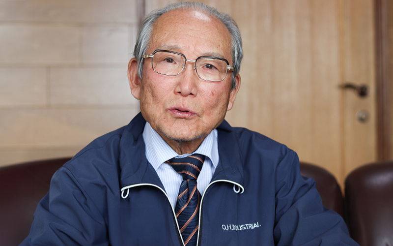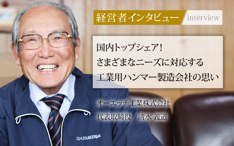清水義道/1939年大阪府生まれ、同志社大学卒業。学生時代から実父が創業したオーエッチ工業株式会社を手伝い、大学卒業後に入社。1973年に代表取締役に就任。国内の工業用ハンマーにおいてトップの地位を確立する。