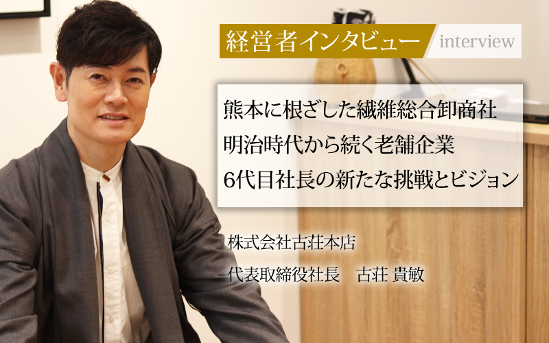 古荘貴敏/1977年熊本県生まれ。慶應義塾大学卒。2000年富士ゼロックス株式会社(現・富士フイルムビジネスイノベーション株式会社)に入社し、5年間法人営業として従事。2005年株式会社古荘本店に入社し、開発事業部にて新規事業開発および法人営業を担当。2017年同社6代目代表取締役社長に就任。熊本商工会議所副会頭として地域経済の発展にも注力している。