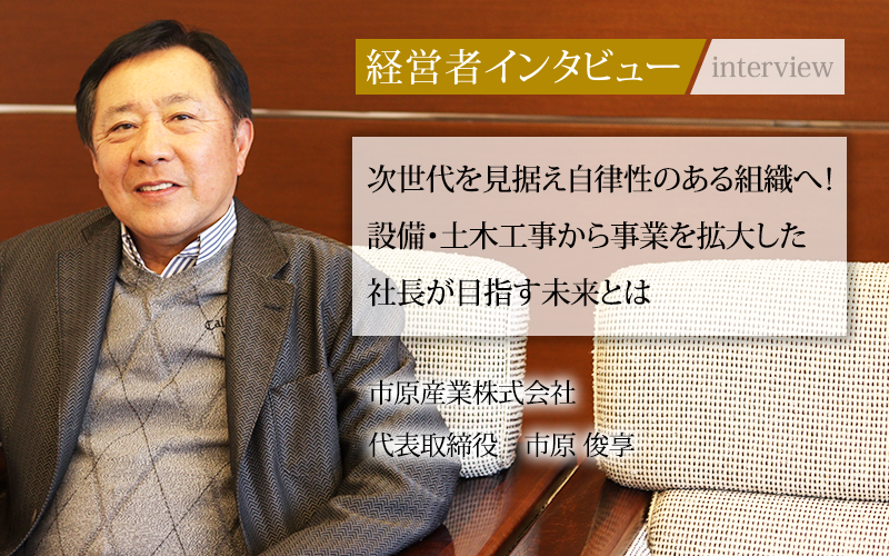 市原俊享/1959年岐阜県生まれ。福井工業大学卒業後、父親が社長を務める市原産業株式会社へ入社。設備・土木工事の現場監督として小さな修理対応から大規模な施設工事まであらゆる現場を経験し、33歳の時に代表取締役に就任。