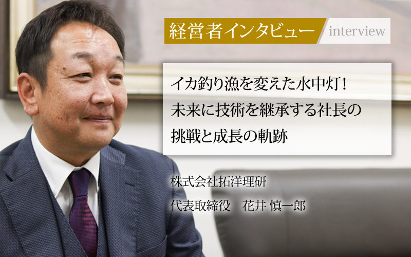水中灯の開発によって0から1を生み出した偉大な先代社長。その礎の上で、1を2に、2を3にすることが2代目の使命だ。実際、花井慎一郎社長は株式会社拓洋理研の年商を先代の頃と比較して3倍以上に増やした。実現の源は、人を大切にしたことだ。従業員や取引先の人々に対する誠実な態度で、業界の信頼を確立した花井社長。同社のさらなる発展を期待したい。