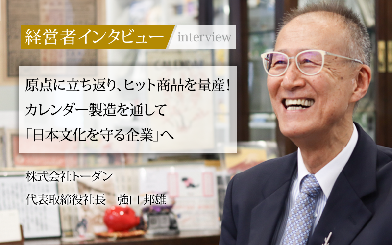 1903年に東京団扇合名会社として創業し、90周年を機に現在の社名となった株式会社トーダン。うちわからカレンダーへと、ものづくりのメインとなる商材を変えた企業の歩みを、代表取締役社長の強口邦雄氏にうかがった。