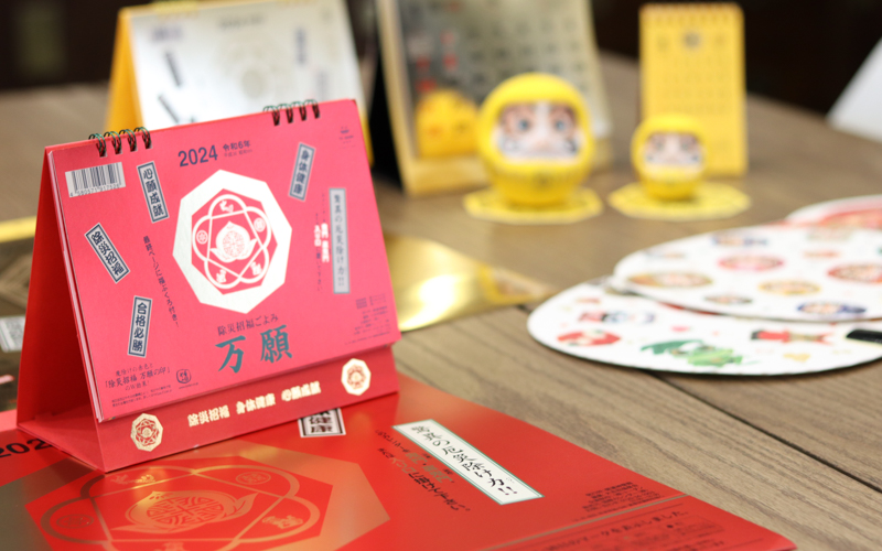 日本には全国各地に民芸品があり、特に縁起物が豊富です。だるま・おたふく・招き猫・えびすさまなど、昔ながらの縁起物をカレンダーで紹介する取り組みに始まり、温故知新ともいえる、伝統品を今風にデザインした商品を展開するようになりました。金運カレンダーの八卦鏡を描いた「金運だるまさん」はブランドを代表する商品です。