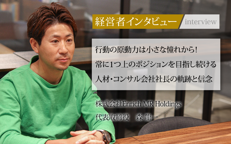 そんなEnrich MR Holdingsを率いる代表取締役の森龍一氏は、2013年に独立起業し、わずか4年間で年商20億円の企業をつくり売却した人物だ。そんな森社長の軌跡や、経営者として大切にする考え方、今後の展望を聞いた。
