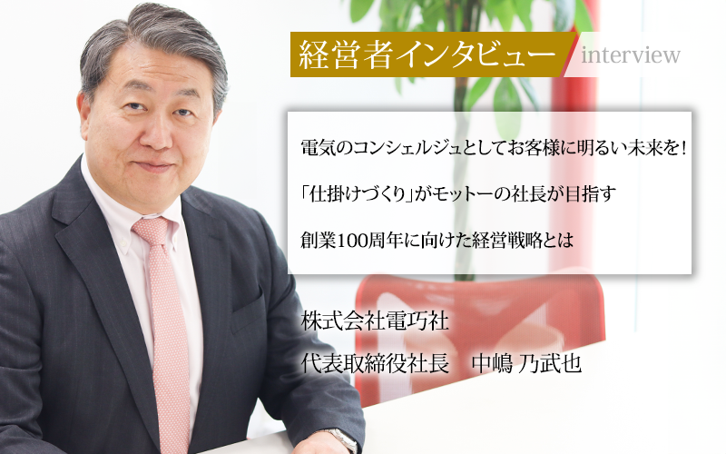 2028年に迎える創業100周年に向けた中期経営計画のなかで、私は電巧社のさらなる強靭化を掲げていて、柱を増やす多角化もそのための策の一つと言えます。私は会社とは社員たちが成功を目指して活躍していくための舞台だと位置づけていて、社員が安心して仕事に打ち込むことができ、存分に活躍できる強靭な舞台を作ることを最大の目標としています。