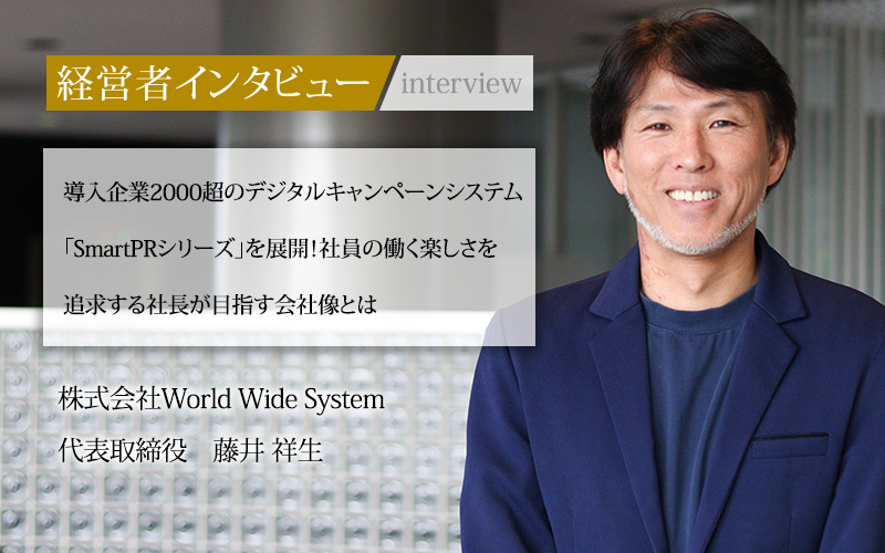 デジタルマーケティング企業、株式会社World Wide Systemを率いる代表取締役の藤井祥生氏は、社員が「楽しく働く」ことを経営の柱としており、その実現に向けたマネジメントに徹している。そんな藤井社長に会社の事業、人材育成への取り組み、経営に関しての思いを聞いた。