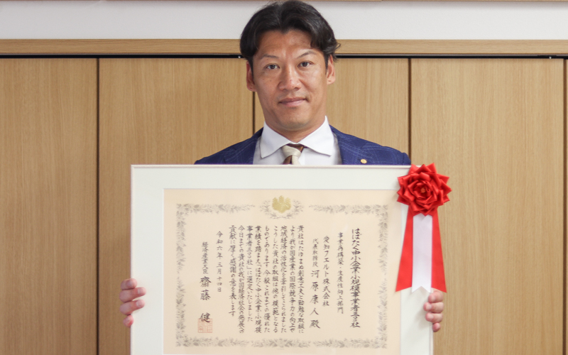 河原康人/1982年、愛知県生まれ。2003年に曾祖父から続く愛知フエルト株式会社に入社。配送から製造まで社業を一通り修業し、のちに取締役、専務取締役を経て、2018年に4代目代表取締役に就任。大手の設備メーカーの存在しないニッチな業界において、製造ライン3ラインの計画から据え付け、条件出しまでを行った経験から、メンテナンスや設備関連業務も新規事業として立ち上げた。古衣料や工業繊維端材のリサイクル活動にも注力している。2023年度、経済社会構造の変化に対応して事業変革や新規事業に挑戦し、地域経済や日本経済の成長への貢献が期待できる中小企業として中小企業庁より「はばたく中小企業・小規模事業者300社」に選定される。(写真)
