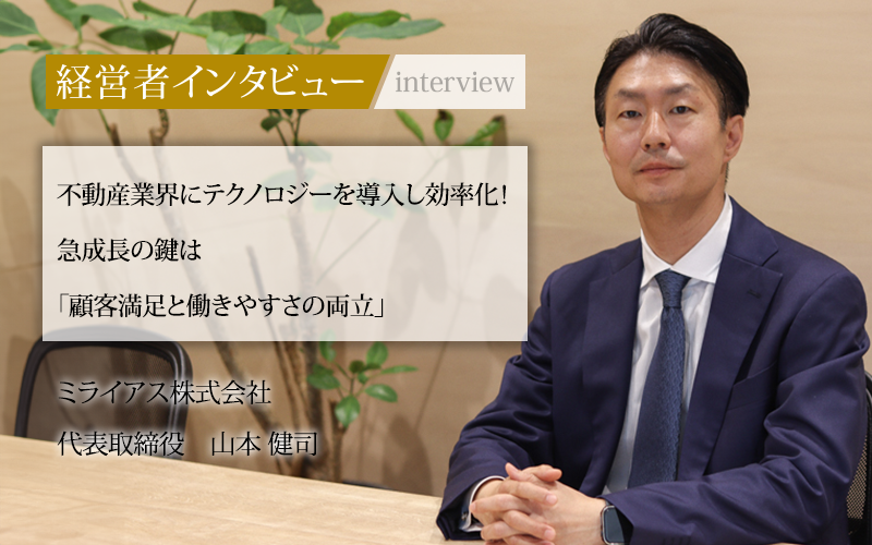 ミライアス株式会社は、不動産売買の仲介サービス「スマート仲介」によって顧客利益を最優先し、急成長を遂げてきた。2018年創業の同社は現在、従業員25名で年10億円を売り上げる。代表取締役の山本健司氏は、大手不動産会社2社で何度もトップセールスを獲得した不動産営業のプロであったが、自らの働き方に疑問を持ち、顧客満足と社員の幸せの両立を目指して起業に至った。不動産業界の慣例を覆して会社を成長に導いた山本社長に話を聞いた。
