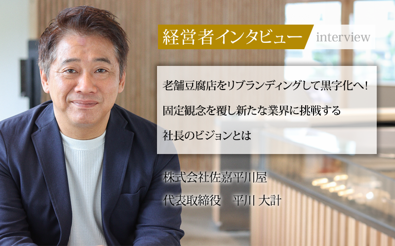 佐賀県武雄市に本店を構える株式会社佐嘉平川屋は老舗豆腐店である。現在、3代目として同社の代表取締役を務める平川大計氏は、運輸省(現在の国土交通省)の官僚出身という異色のキャリアを持つ経営者だ。